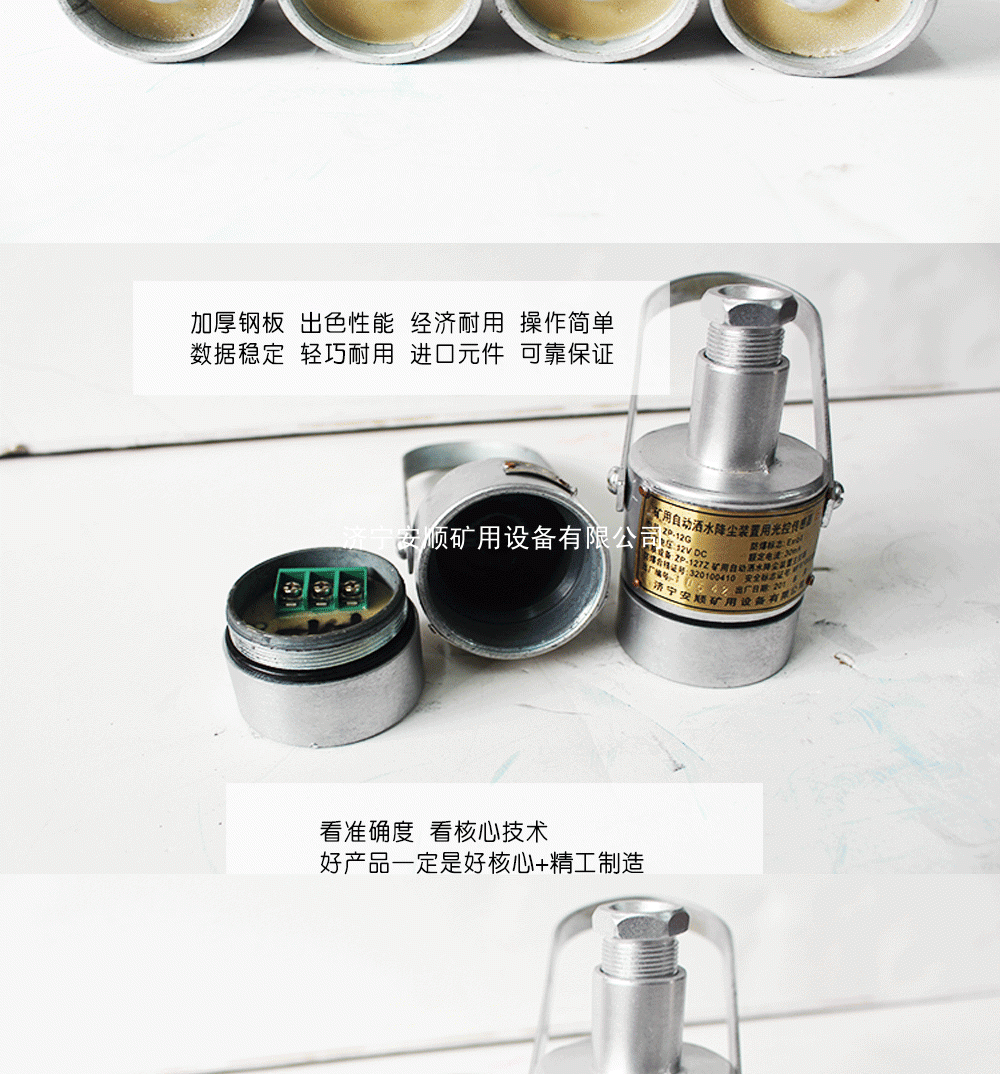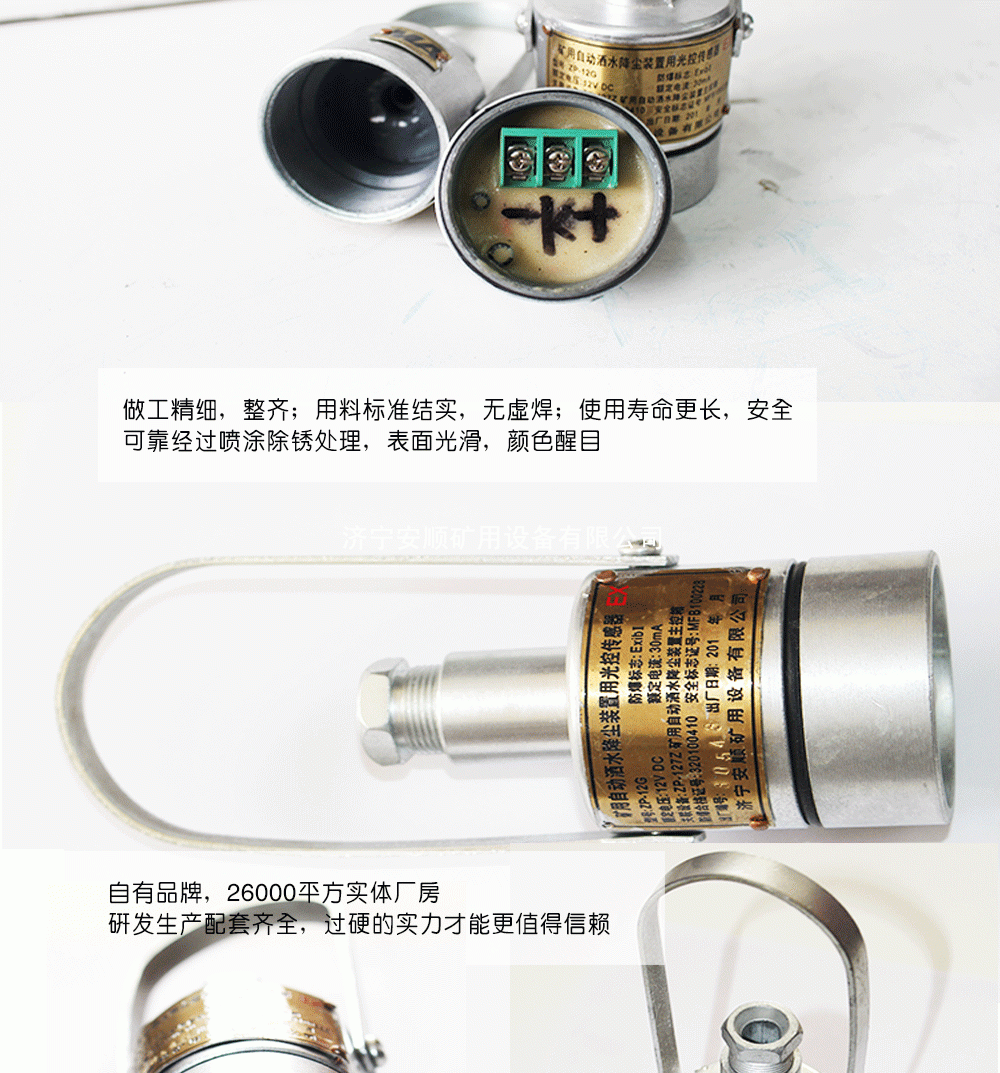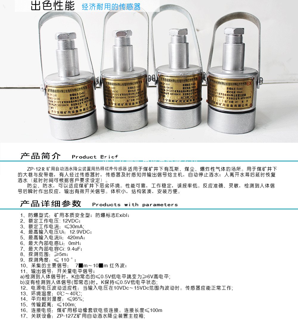 ZP-12R矿用自动洒水降尘装置用光控传感器适用于煤矿井下有瓦斯、煤尘、爆炸性气体的场所。用于煤矿井下的大巷与皮带巷,有人经过传感器时,传感器及时感知并输出信号给主机,自动停止洒......