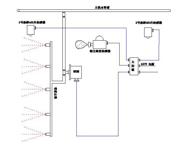 该装置可实现煤矿主巷道和运输巷道等环境的自动化降尘功能,当环境粉尘含量高于粉尘浓度传感器设定报警值时,粉尘浓度传感器有报警信号输出并将信号上传到主控箱,控制电动球阀打开喷雾降尘;喷雾期间有行人通过喷雾区时,热释红外传感器探测到行人型号并上传主控箱,控制电动球阀关闭喷雾,行人离开后延时30s喷雾自动恢复喷雾;当环境粉尘浓度低于设定报警值时,电动球阀将自动关闭喷雾。